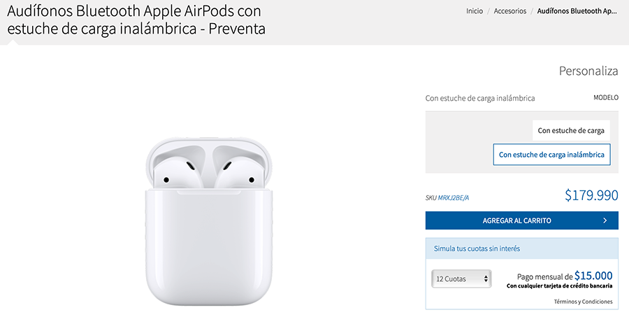 Los precios para el AirPod 2 con estuche normal es de CLP$149.990.- mientras que el Air Pod 2 con estuche inalámbrico tendrá un valor de CLP$179.990.-