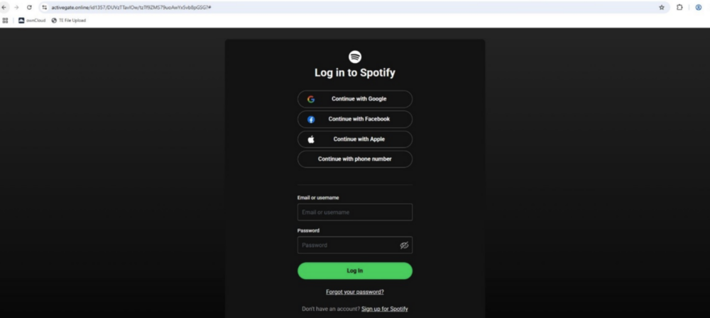 En el caso de Spotify, los atacantes crearon una página de inicio de sesión falsa, alojada en: premiumspotify[.]abdullatifmoustafa0[.]workers.dev, que redirigía a activegate[.]online/id1357/DUVzTTavlOw/CgJiMcgc0fMOJY29SAg5JRoH?. Esta página replicaba fielmente la experiencia de inicio de sesión oficial de Spotify, incluyendo elementos visuales y de diseño. Una vez introducidas las credenciales, las víctimas eran dirigidas a una página falsa de pago que intentaba capturar datos de tarjetas bancarias.