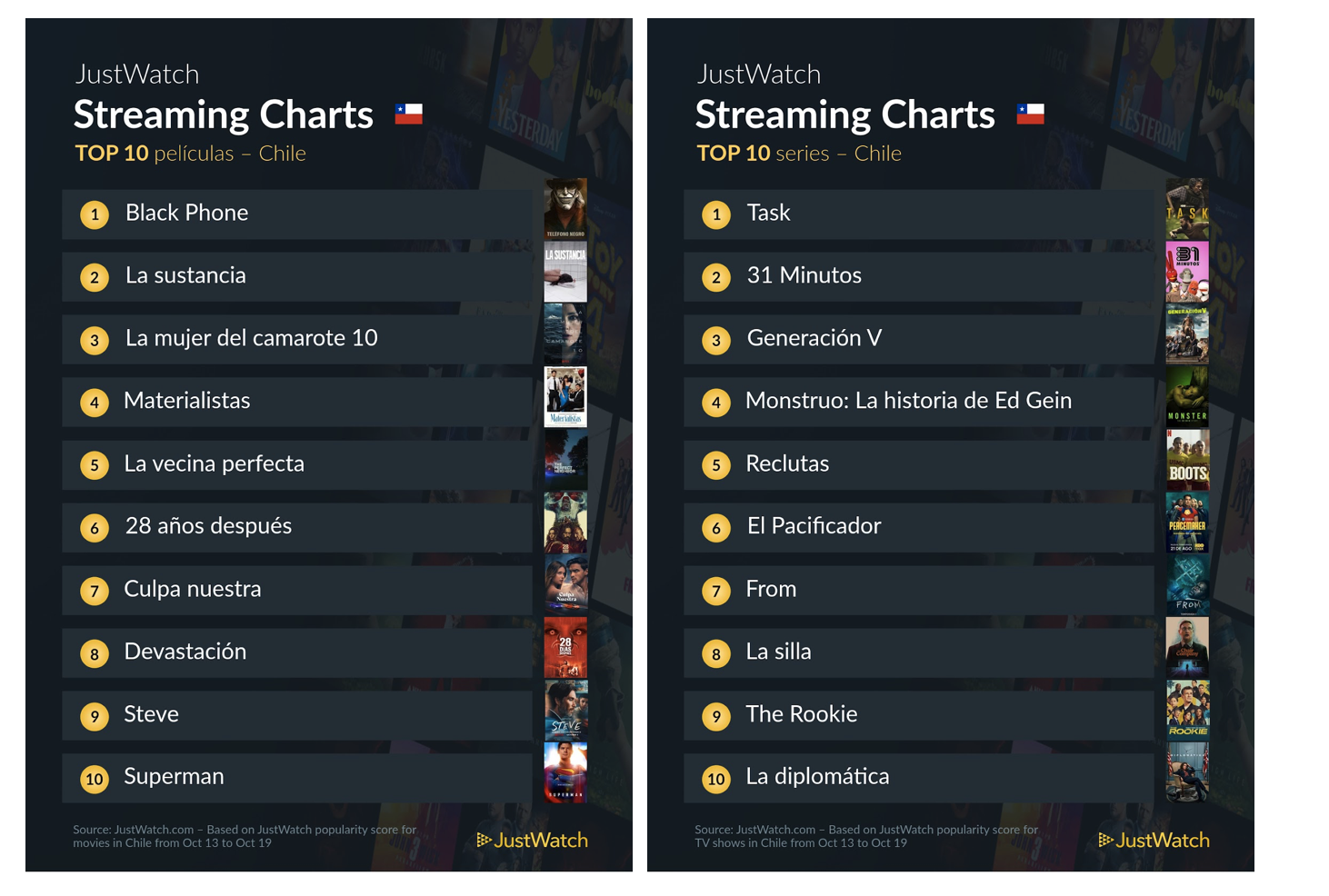 En el apartado de series, la recién estrenada «Task» cautivó a los usuarios, seguida del resurgimiento de «31 minutos» el clásico del humor infantil- adulto de la televisión de Chile y que impactó a los usuarios de todo el mundo tras su presentación formato Tiny Desk en EE.UU.
