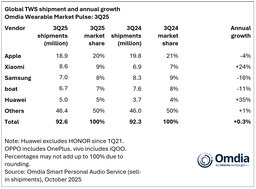 Apple siguió siendo el líder de ingresos globales a pesar de una disminución del 4 % en los envíos, capturando alrededor de la mitad de todo el valor de mercado de TWS a través de la fuerza del ecosistema y el posicionamiento premium.