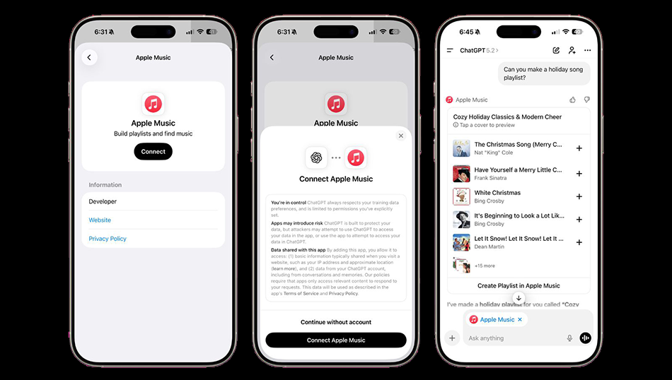ChatGPT se puede utilizar para buscar canciones, artistas, álbumes y listas de reproducción a través del catálogo de Apple Music, incluso sin una suscripción a Apple Music. OpenAI dice que todos los usuarios pueden descubrir música, generar listas de reproducción y escuchar clips de vista previa en ChatGPT.
