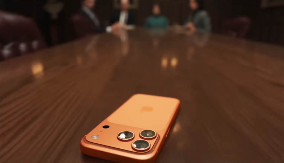 El anuncio muestra una negociación en curso, durante la cual un iPhone 17 Pro con la pantalla hacia abajo se desliza hacia adelante y hacia atrás a través de una mesa larga.