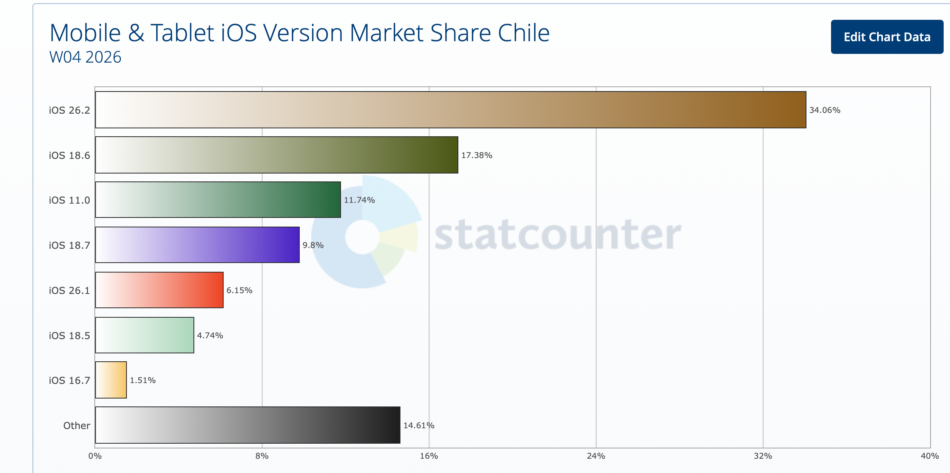 Si bien los usuarios de EE.UU se acercan al 40% de adopción a esta última versión, los dueños de iPhone en Chile, por ejemplo, alcanzan al 34.6%.