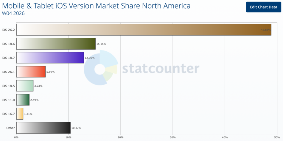 Por su parte, la firma SellCell, la cual mide comportamientos de compra de usuarios en EE.UU, señala con sus propias cifras que el 78 % de los encuestados dicen que han actualizado su iPhone a iOS 26, mientras que el 22 % informa que todavía están ejecutando una versión anterior de iOS.