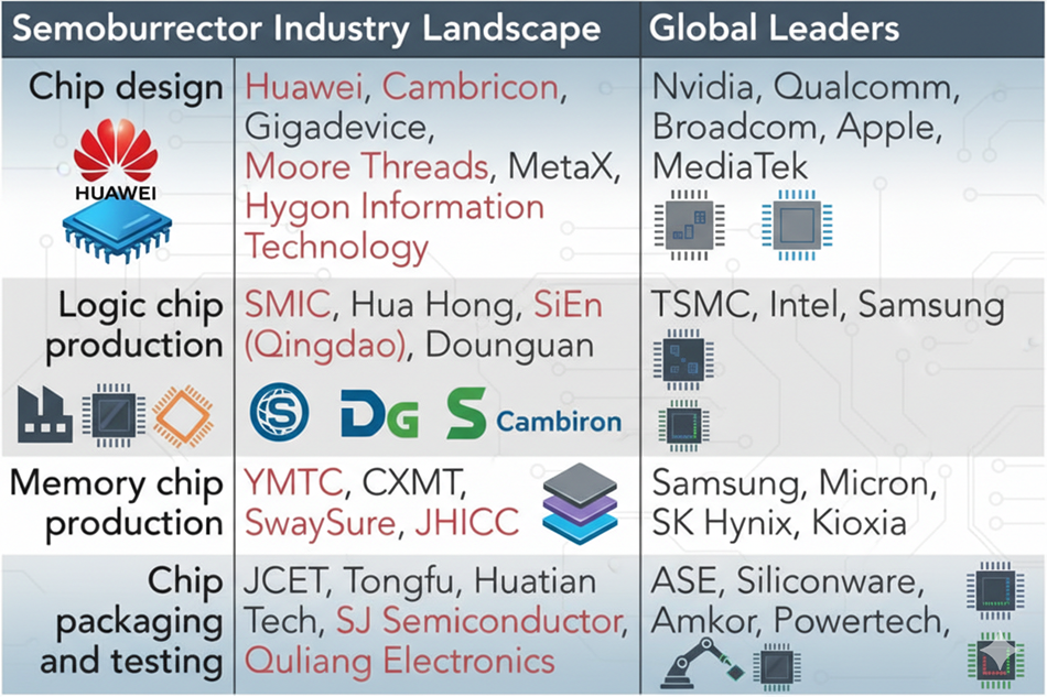Huawei corre por ahora con ventaja y mayor apoyo en términos de capacidad de producción local, seguido por Cambricon Technologies, T-head de Alibaba, Sugon Information y otros desarrolladores locales de IA como Moore Threads y MetaX.