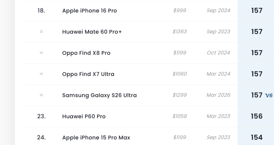 El Samsung Galaxy S26 Ultra en la última medición del sitio especializado DXO Mark, ubicó al dispositivo en el lugar 23, una posición incómoda que lo sitúa por sobre el Huawei P60 y el iPhone 15 Pro Max de hace tres años.