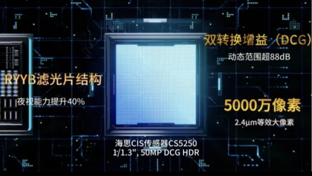 Quad-in-One, cuenta con 50 MP, píxeles grandes equivalentes a 2,4 µm, una sensibilidad de más de 88 dB y un gradiente de color RYYB, que mejora la visión nocturna en un 40 %, optimiza el color y reduce el ruido de movimiento en la oscuridad.