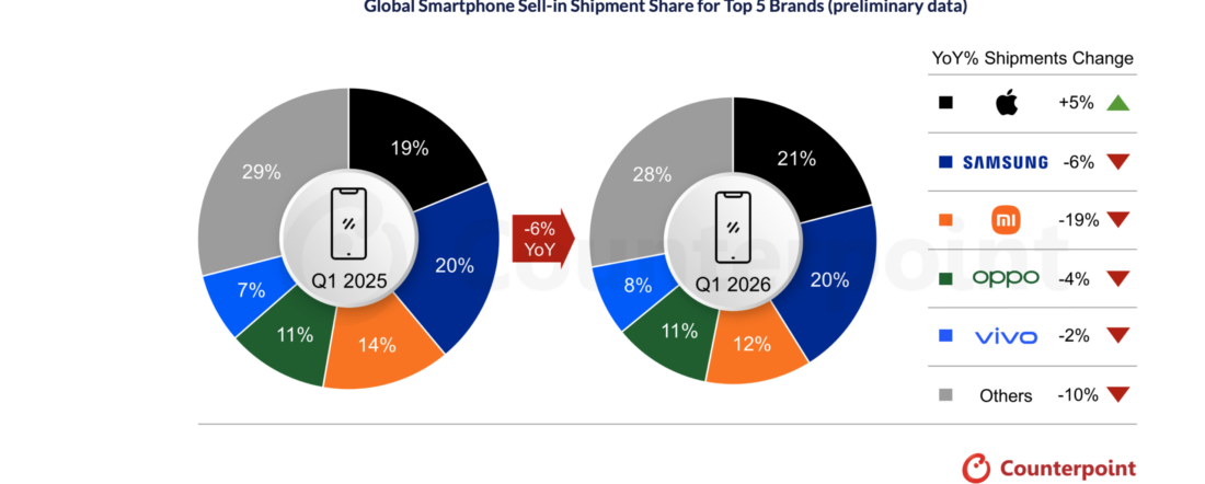 Los envíos de Samsung disminuyeron un 6 % interanual en el primer trimestre de 2026 con una cuota de mercado del 20 %, ya que la marca enfrentó desafíos debido a una demanda más débil en el segmento del mercado masivo y un retraso en el lanzamiento de la serie S26.