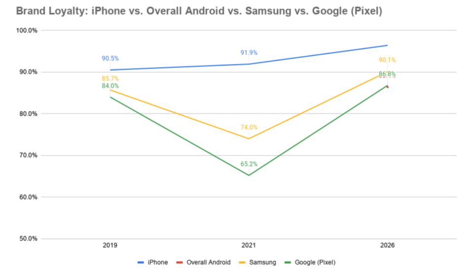 Mientras que la mayoría de los usuarios de Android dijeron que se cambiarían a un dispositivo Samsung o Google, el 26,8 % dijo que elegiría un iPhone en lugar de un teléfono inteligente Android.