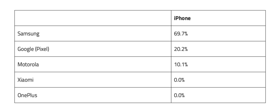 Del 3,6 % de los usuarios de iPhone que dijeron que se trasladarían a otra plataforma, el 69,7 % dijeron que elegirían un teléfono inteligente Samsung, y el 20,2 % dijeron que elegirían un teléfono Google Pixel.