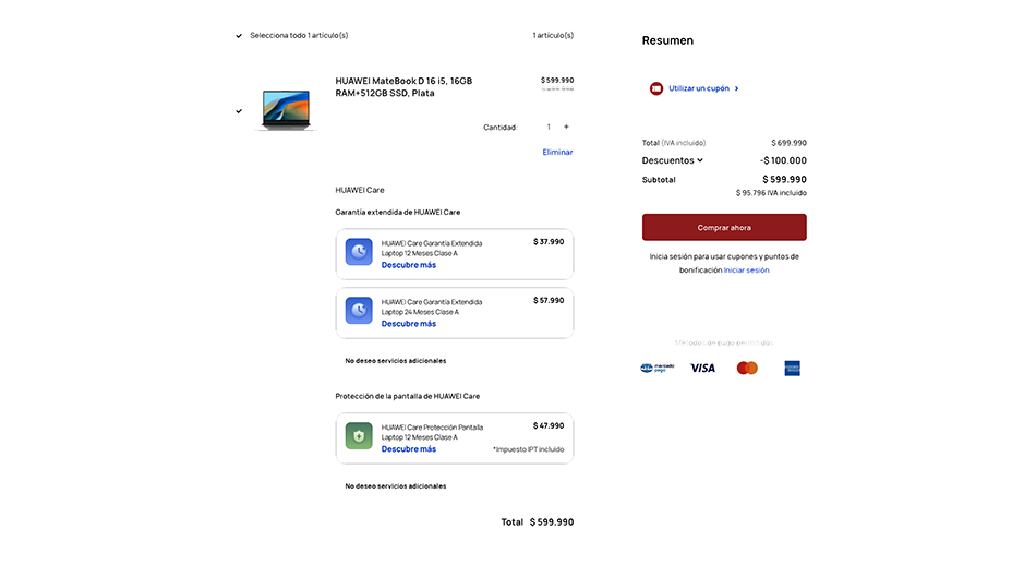 Con procesador Intel, Microsoft Windows y corresponde al modelo que aparece en el sitio Web de Huawei en Chile Huawei MateBook D16 etiqueta de precio de $599.990.- (US$680.-)